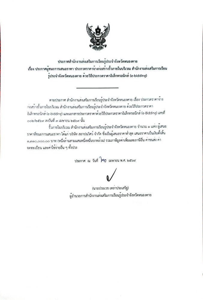 ประกาศสำนักงานส่งเสริมการเรียนรู้ประจำจังหวัดหนองคาย เรื่อง ประกาศผู้ชนะการเสนอราคา ประกวดราคาจ้างก่อสร้างรั้วภายในบริเวณ สำนักงานส่งเสริมการเรียนรู้ประจำจังหวัดหนองคาย ด้วยวิธีประกวดราคาอิเล็กทรอนิกส์ (e-bidding)